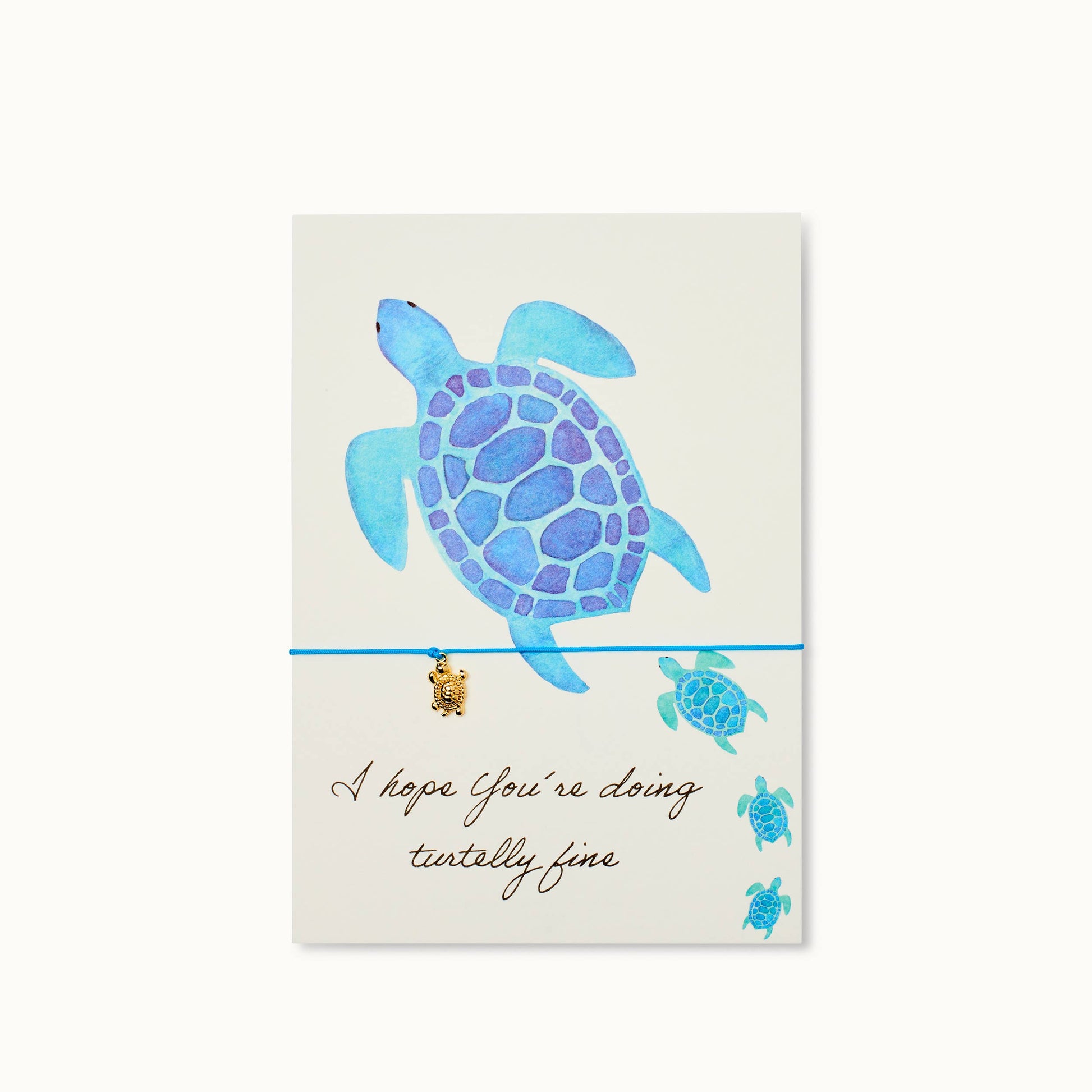 Card with a turtle as an 18K gold-plated pendant on a blue bracelet.