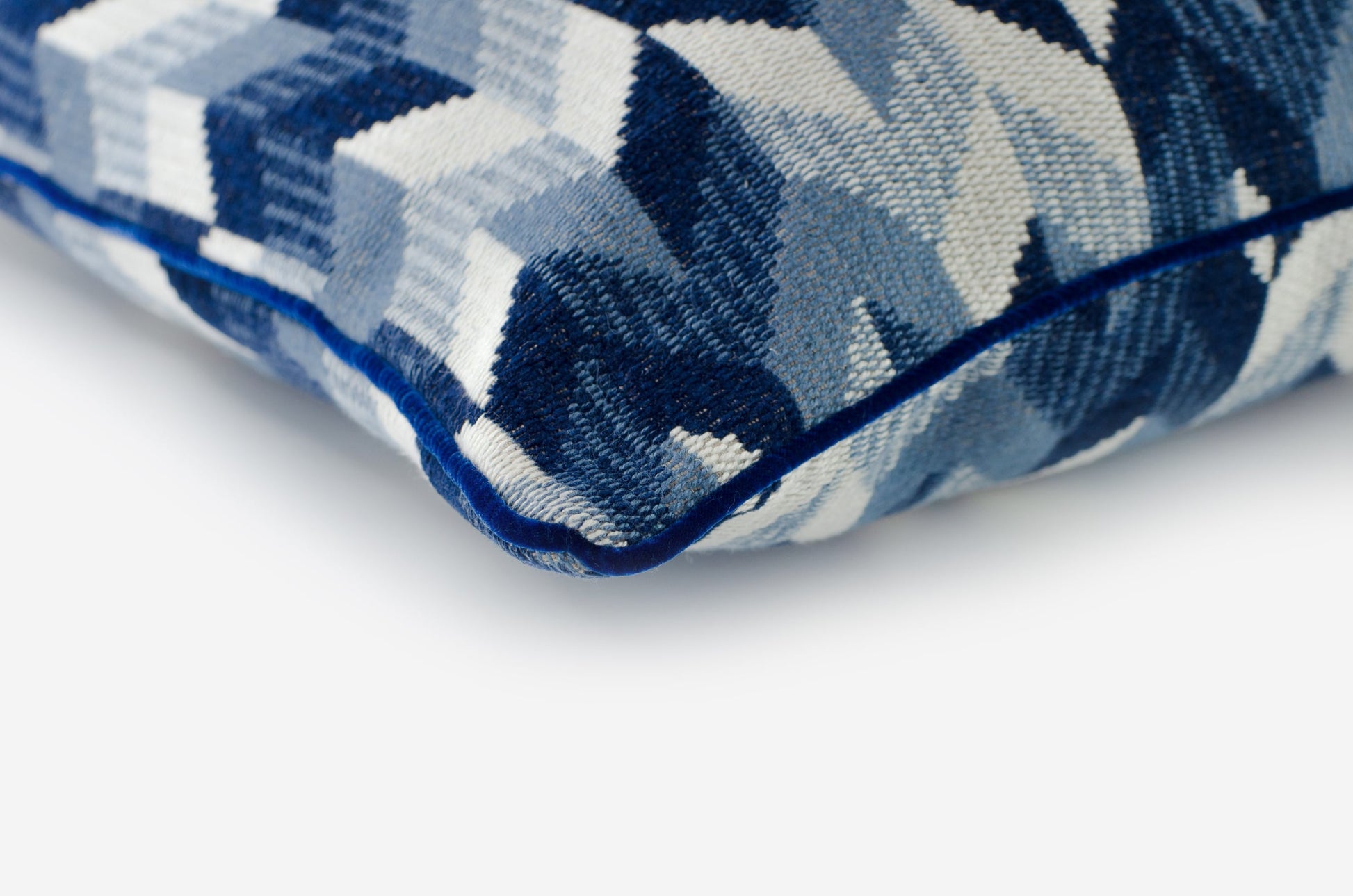 Gimignano cushion cover with stuffing. Multi-coloured geometry in cotton and linen. Finished with velvet trimmings.