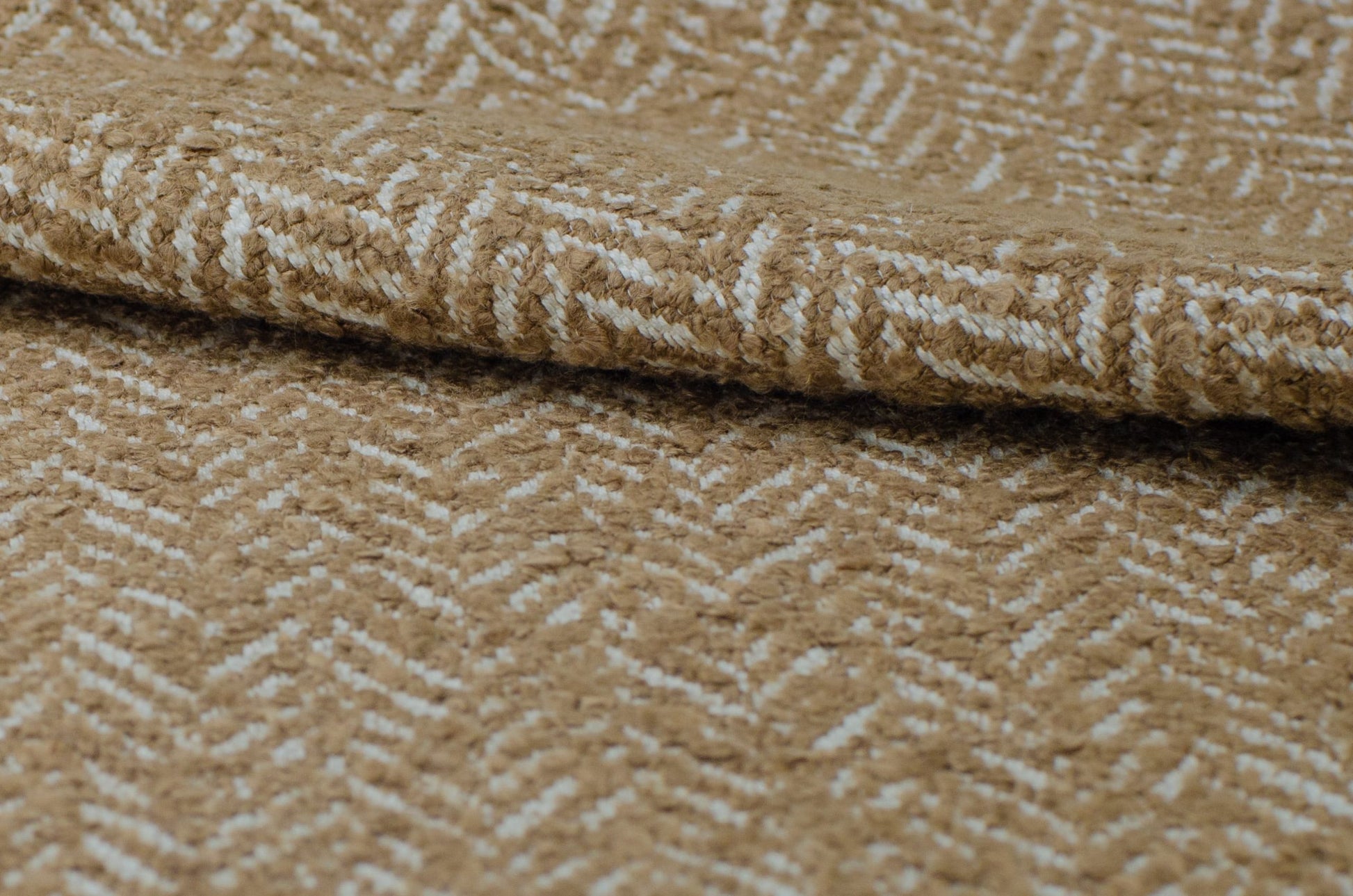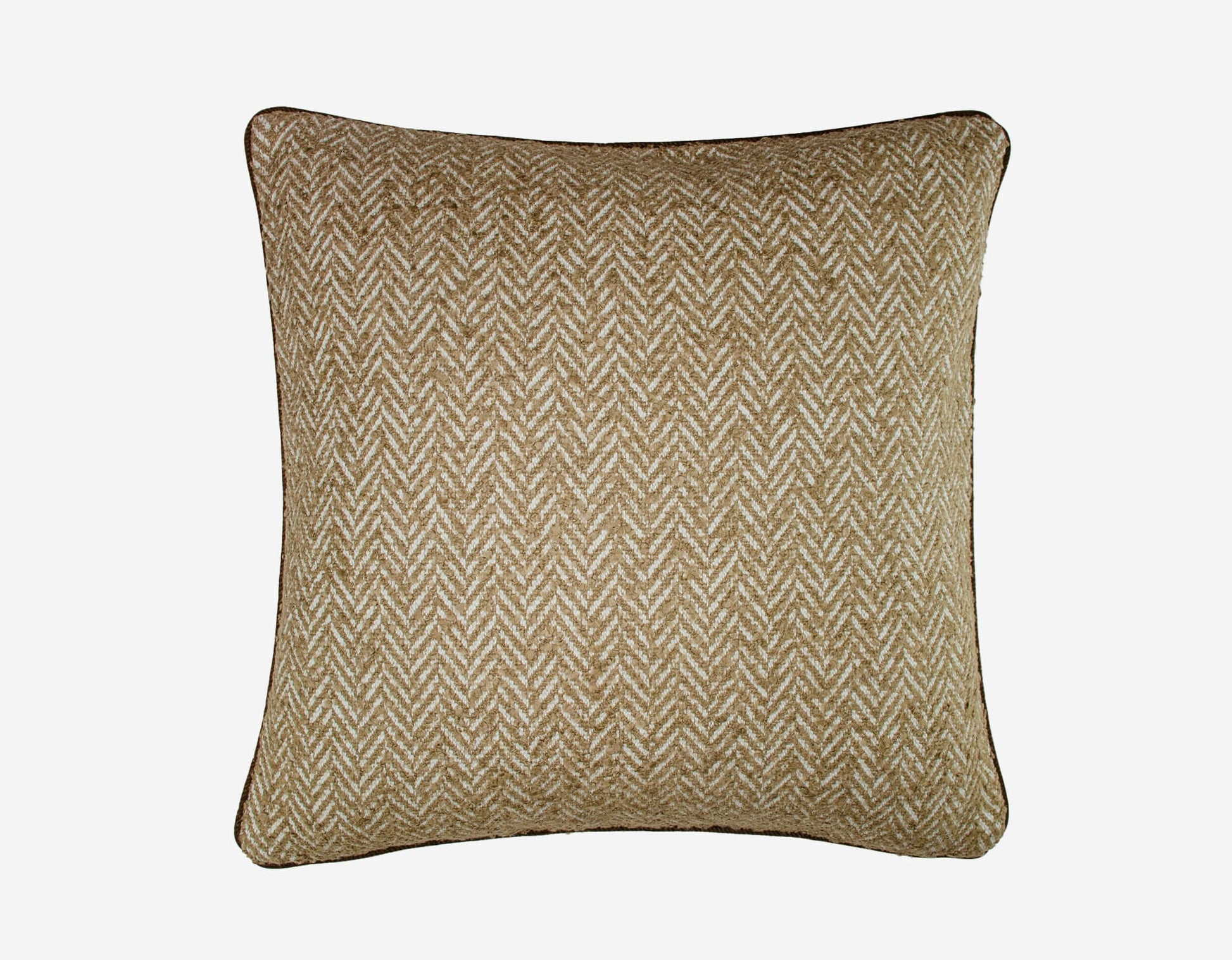 Orcia cushion cover with stuffing. Herringbone pattern with cotton/viscose boucle thread. Finished with velvet trimmings.