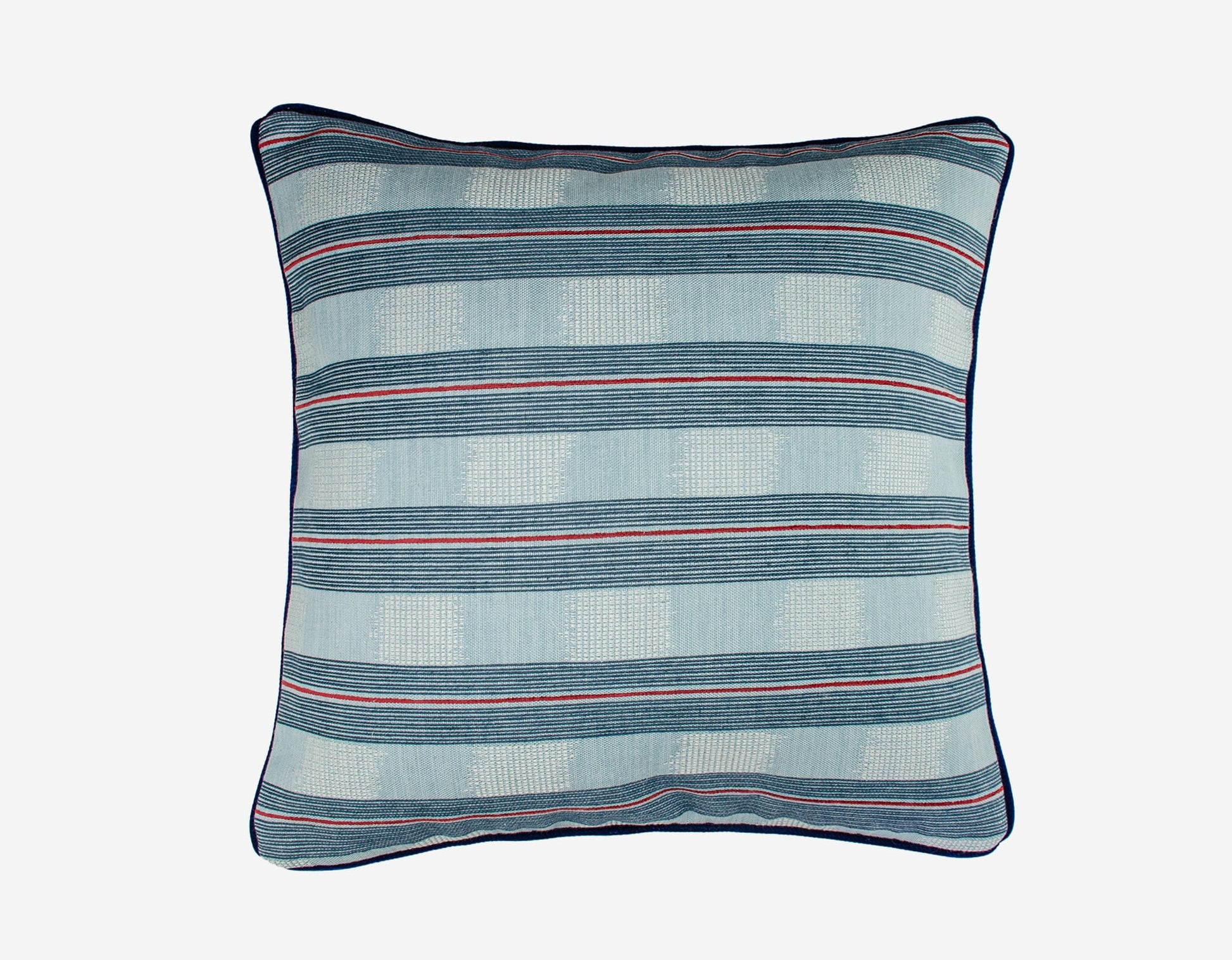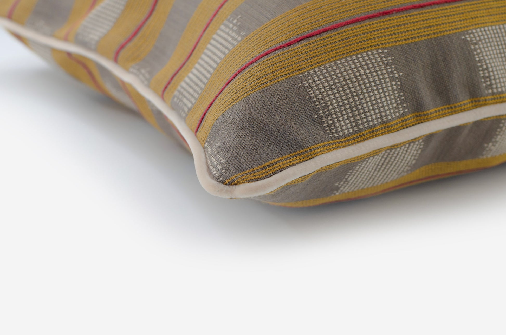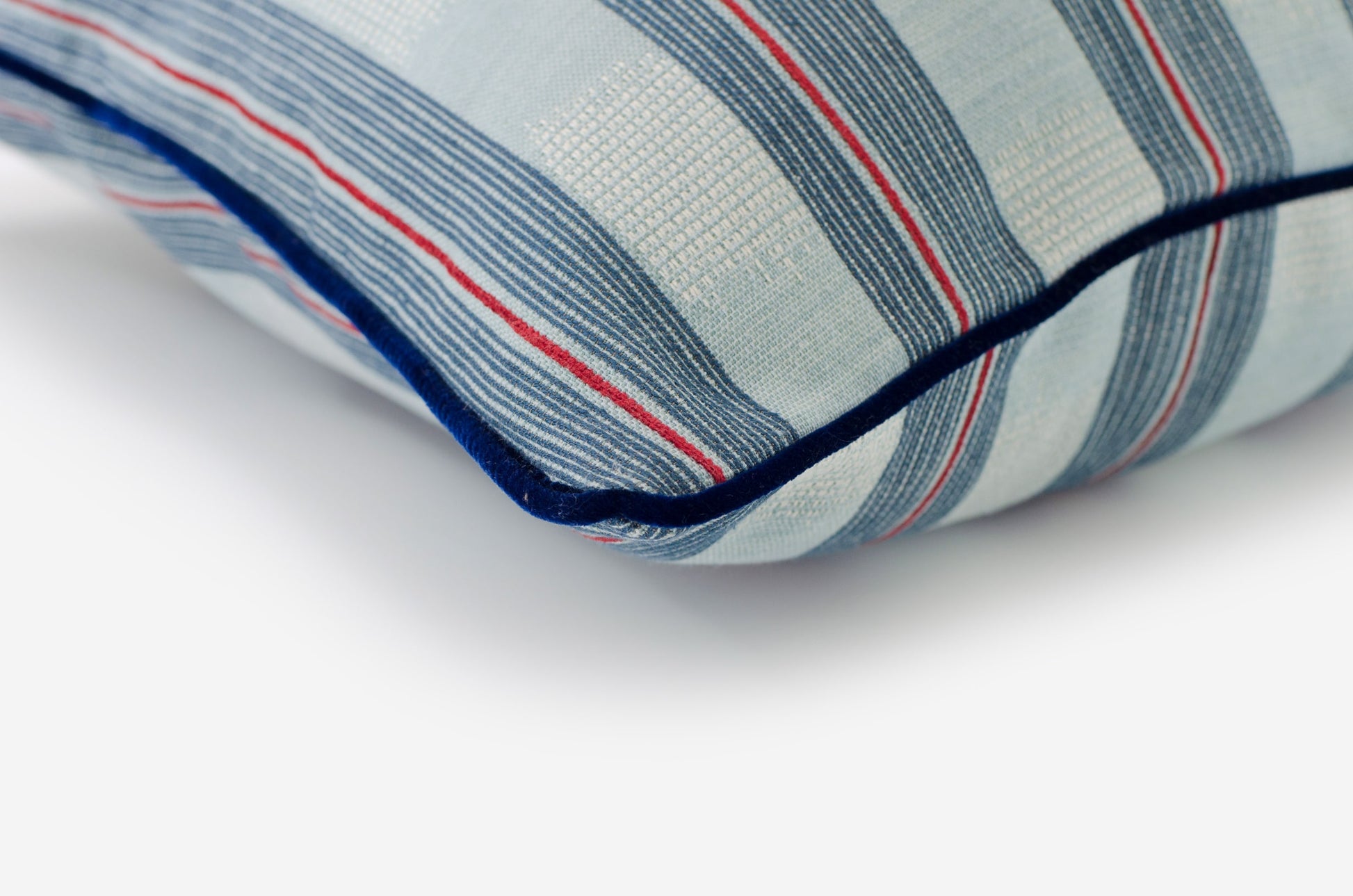 Siena cushion cover with stuffing. Rail roaded stripe with linen and chenille and finished with velvet trimmings.
