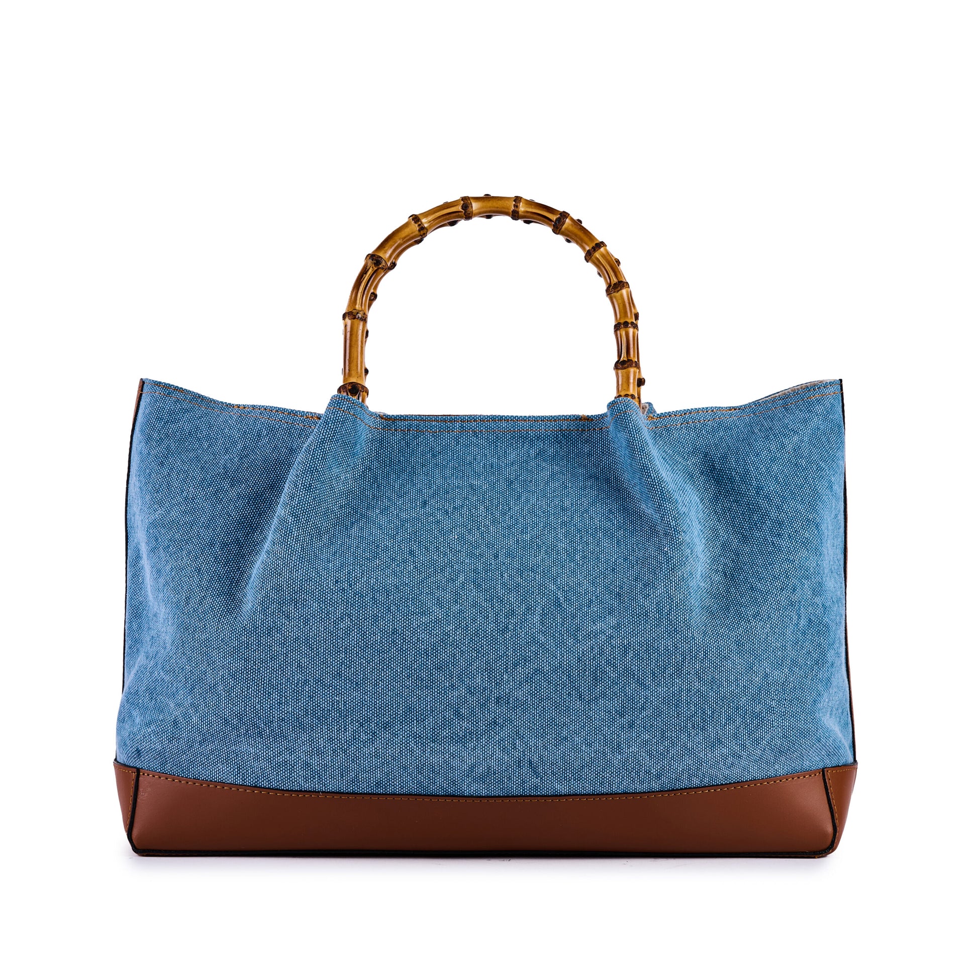 Shopping bag made of hand-embroidered eco suede, bamboo handles, internal pocket and patterned shoulder strap with leather details.