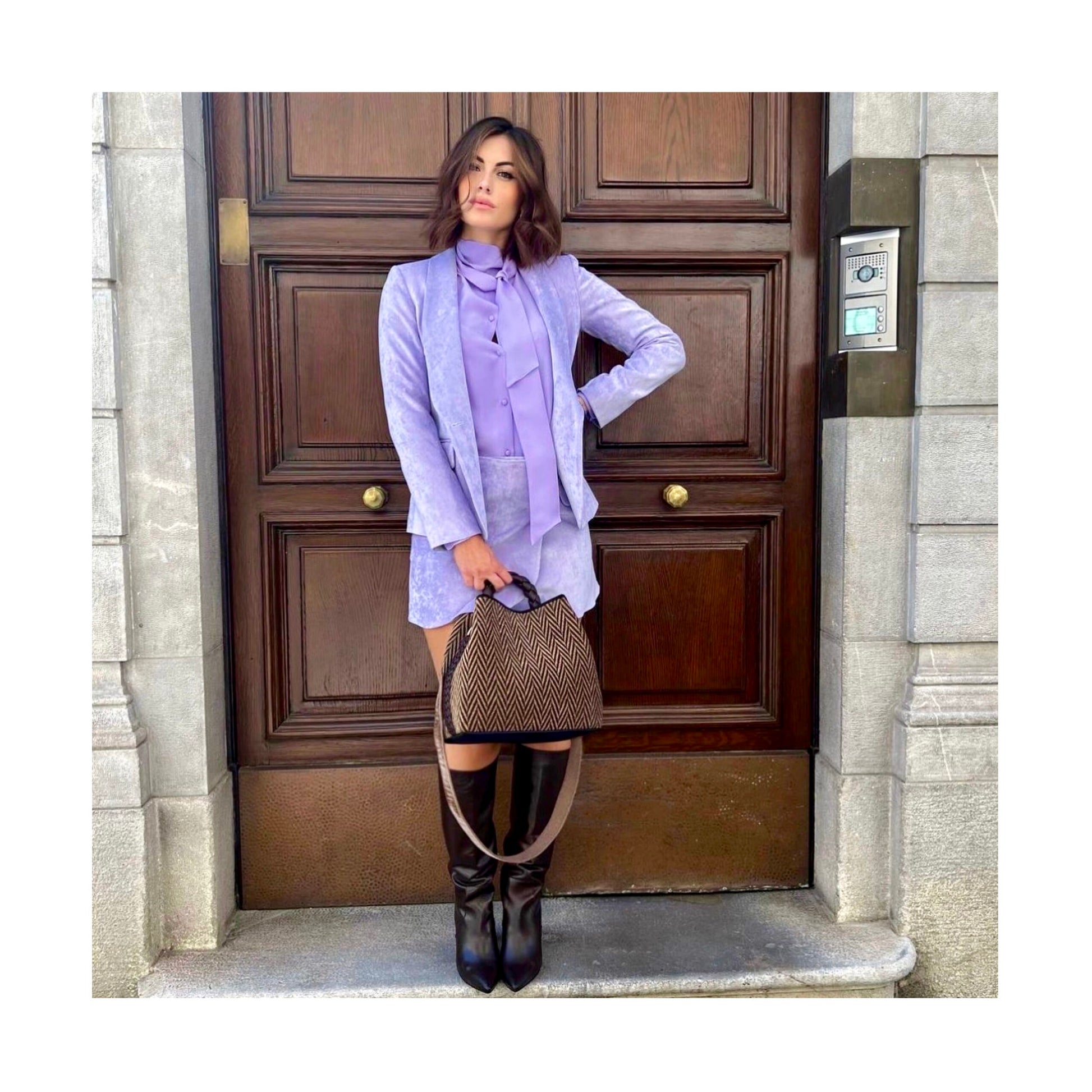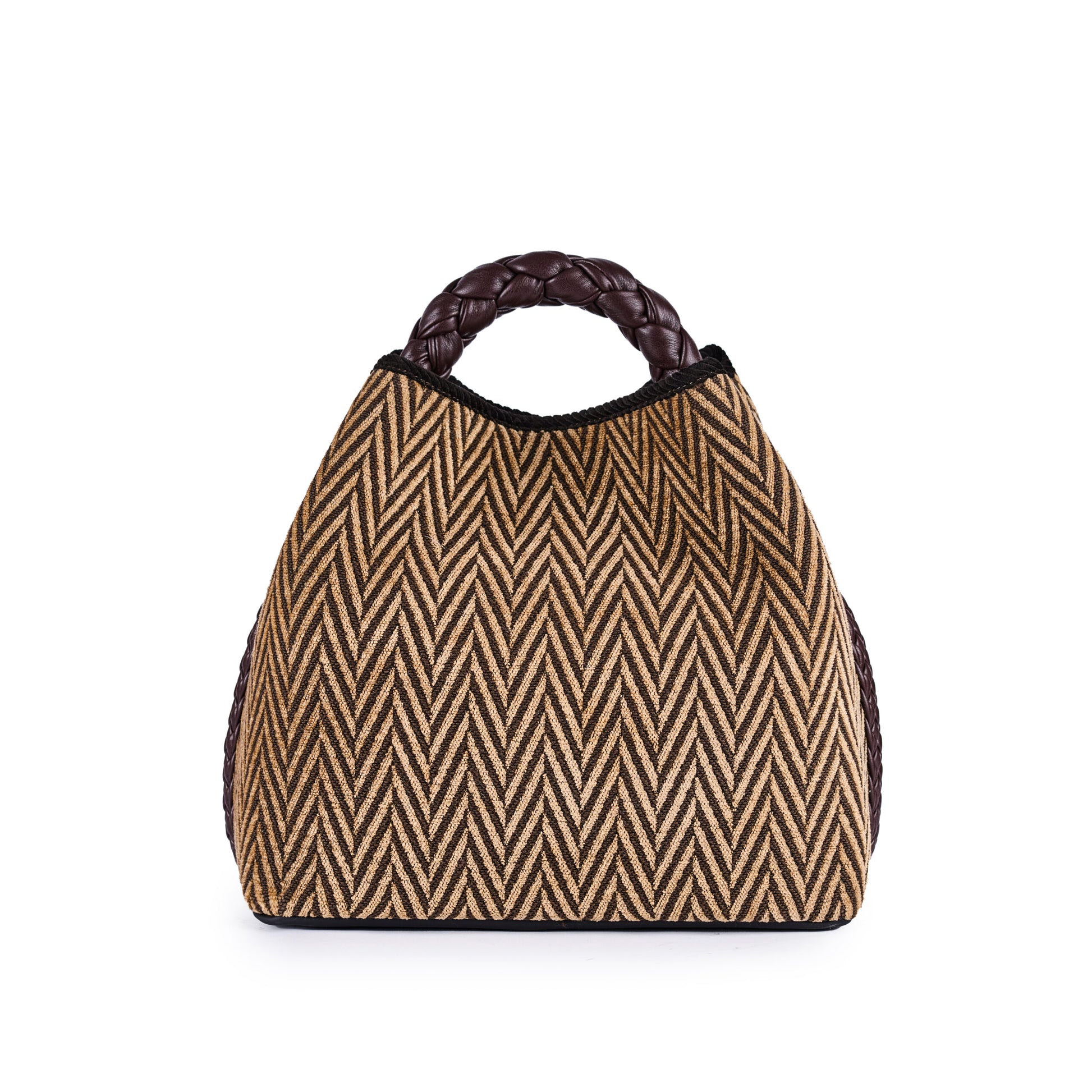 Jacquard chenille bucket with eco-leather braid detail, hand-braided handle, internal pocket and velvet shoulder strap.