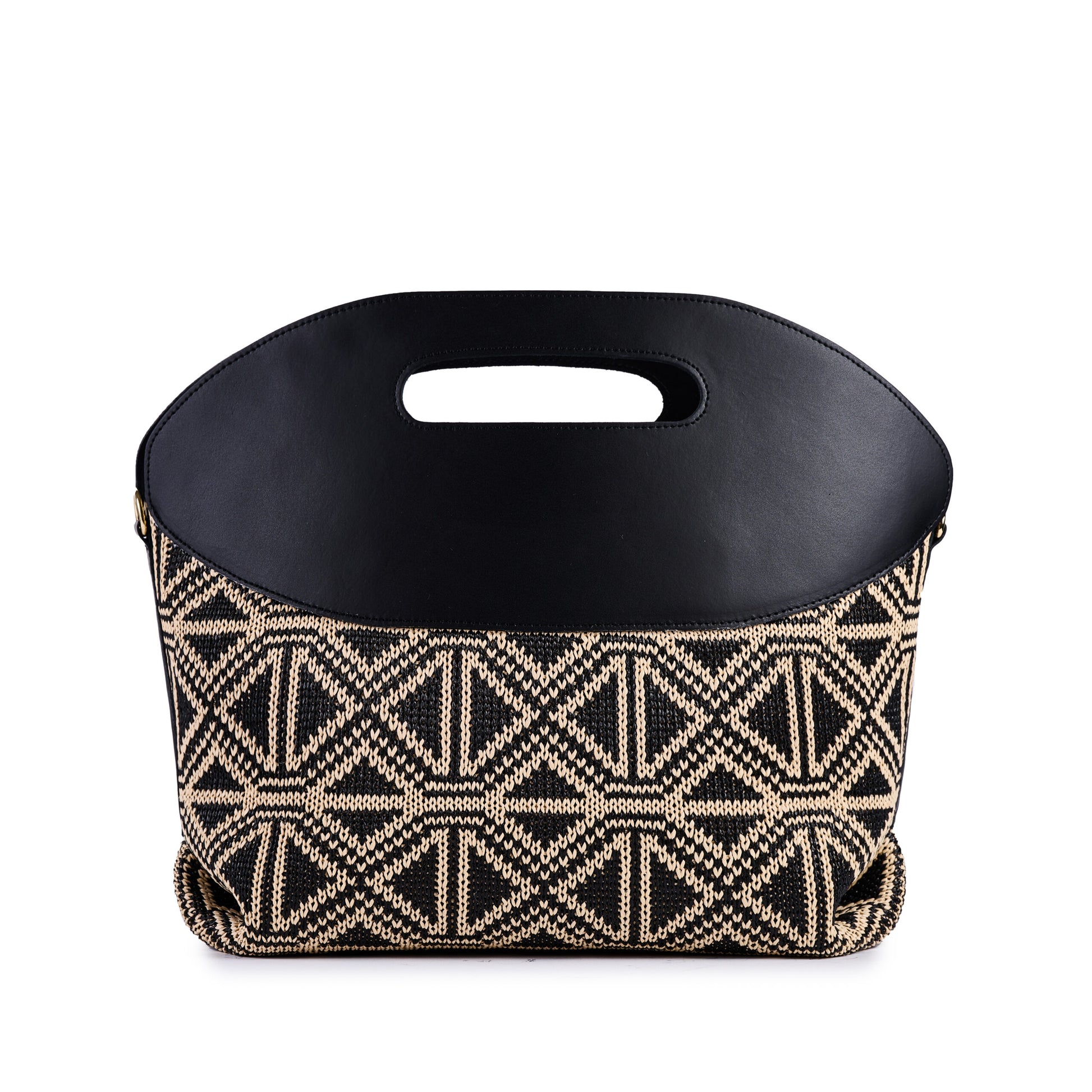 Shopping bag made of raffia and leather, internal pocket and leather shoulder strap.