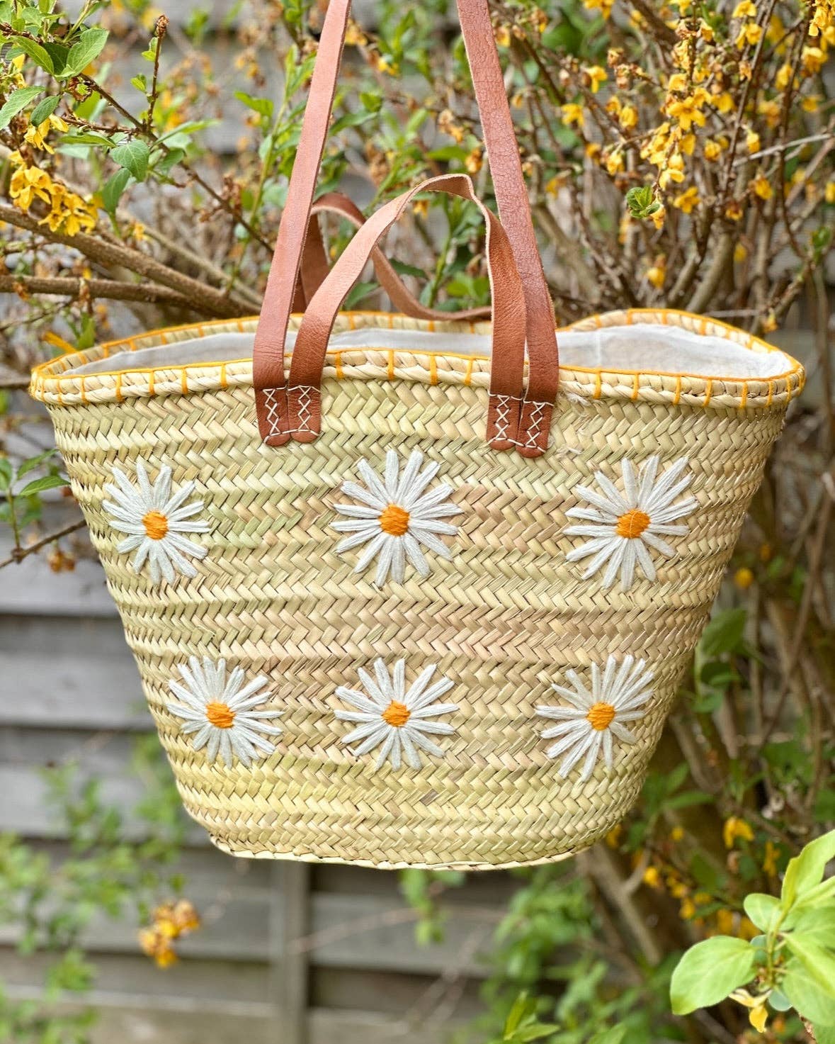 Bring sunshine wherever you go with our handwoven straw tote bag featuring charming white daisy embroidery. This beautifully crafted summer basket is made from durable natural palm leaves and finished with sturdy real leather handles for comfortable carrying. Whether you're heading to the beach, farmers' market, or a weekend getaway, this spacious boho-chic tote is both practical and stylish.