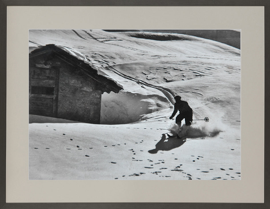 Photo Montagne is a striking black-and-white print that captures a timeless winter moment in the mountains. A lone skier glides through fresh snow near a rustic alpine cottage, set against a backdrop of soft hills and quiet wilderness. The composition radiates calm, solitude, and adventure—bringing a touch of vintage charm and natural beauty to any interior. Printed on premium quality paper, it showcases crisp detail and rich tonal depth.