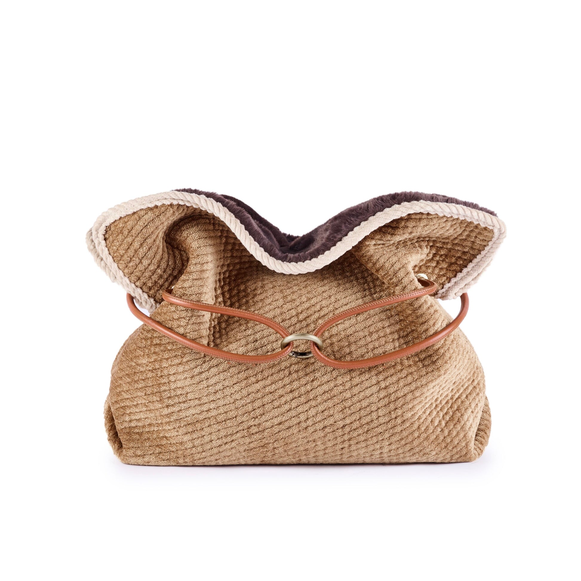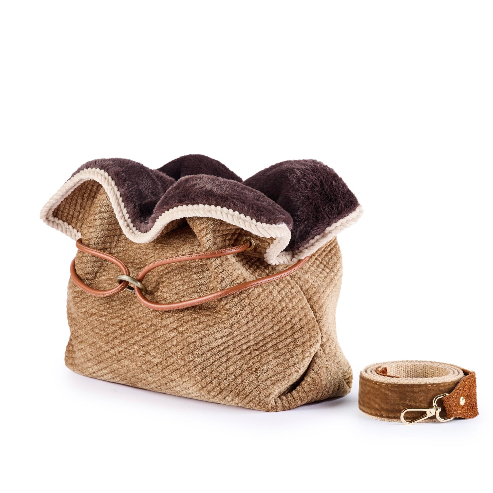 Jacquard chenille bag with contrasting faux fur interior, resealable with eco-leather tubing, internal pocket and velvet shoulder strap.